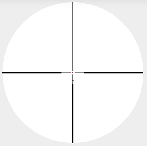 This design also makes it suitable for European shooters who might prefer a metric set of figures and therefore to zero their rifle in for 100 metres on the centre crosshair and use the lower aim points for 200, 300, 400 and 500 metres. A useful tip: at 8x magnification, the thick posts to the right and left of the centre dot would bracket the body length of a Roe deer at 100yds; a popular sized animal to hunt with this type of reticle.